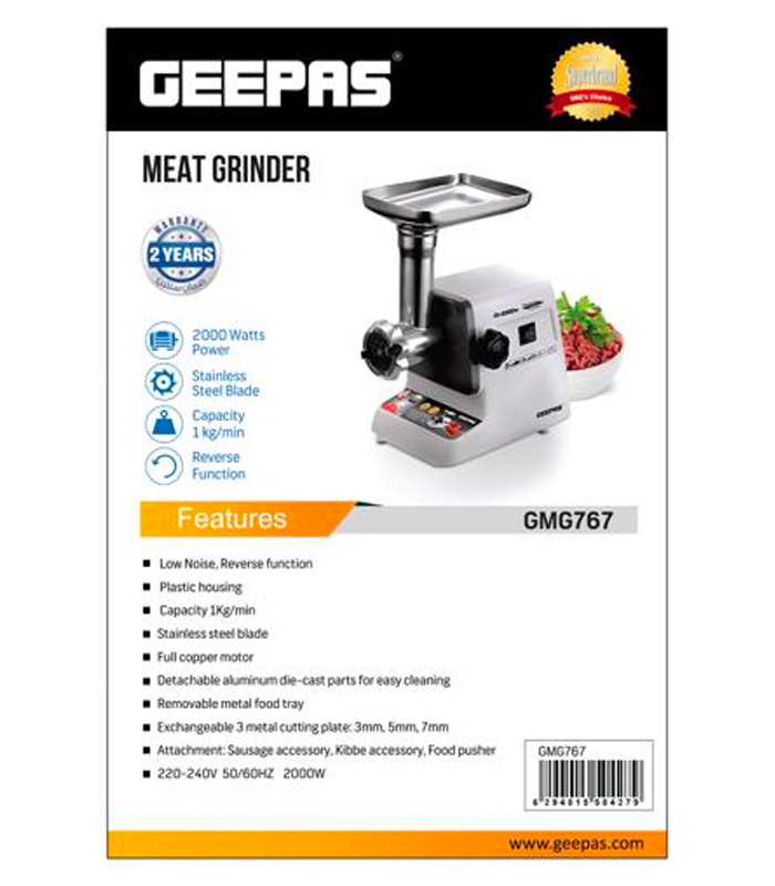 The Geepas GMG767 is a perfect modern day example of a meat grinder with stainless steel blade and reverse function. Designed with low noise feature, thedetachable aluminium die cast parts to enable easy cleaning and using any time of the day or night without disturbing anyone.