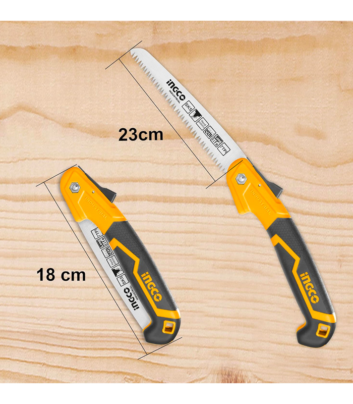 - Size: Total length of 9.1 inches (230 mm) when folded. Blade length is 180mm. TRIPLE TEETH – Made of high strength SK5 steel with hardness and durability for fast cutting and long life. Heat treated houndstooth (7 TPI) provides smooth and sharp sewing, and the multi-angle saw teeth maximize the cutting efficiency of wood.
