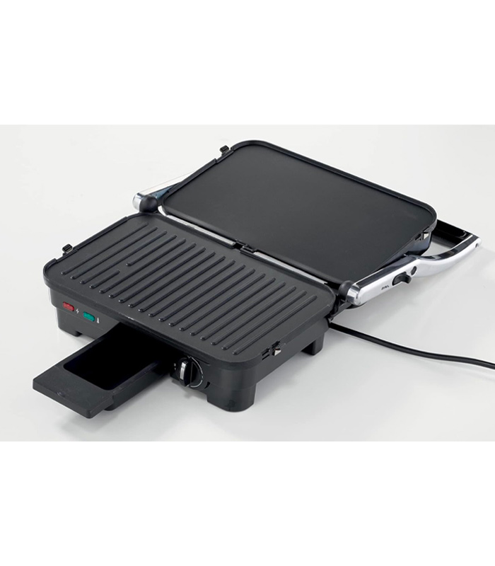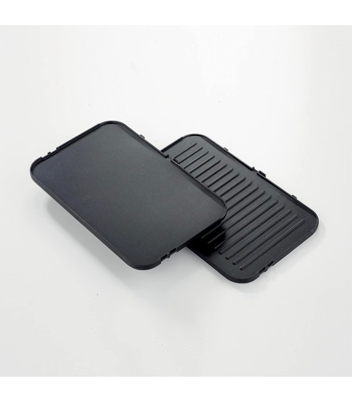 - Open flat large grill area. Double sided grill, push buttons for easy grill plate release