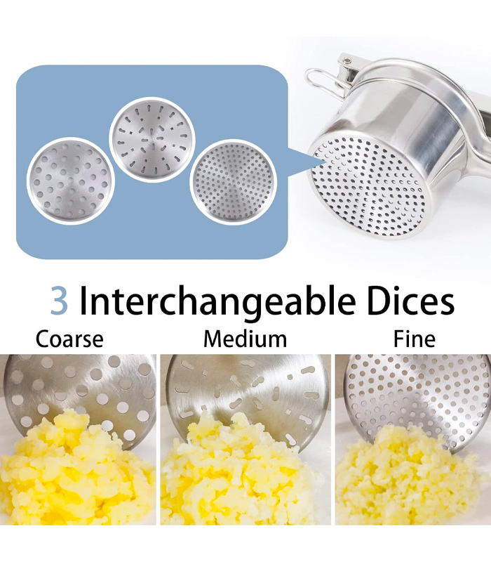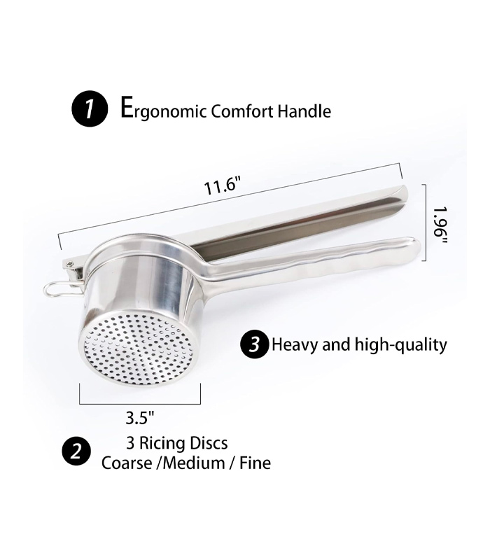 - 【Multi-use Potato Masher】3 changeable discs giving you full control of meals make fine, medium, or coarse sized.The potato ricer not only used for mashed potatoes, but also very prefect for carrots, cauliflower, pumpkin and baby food